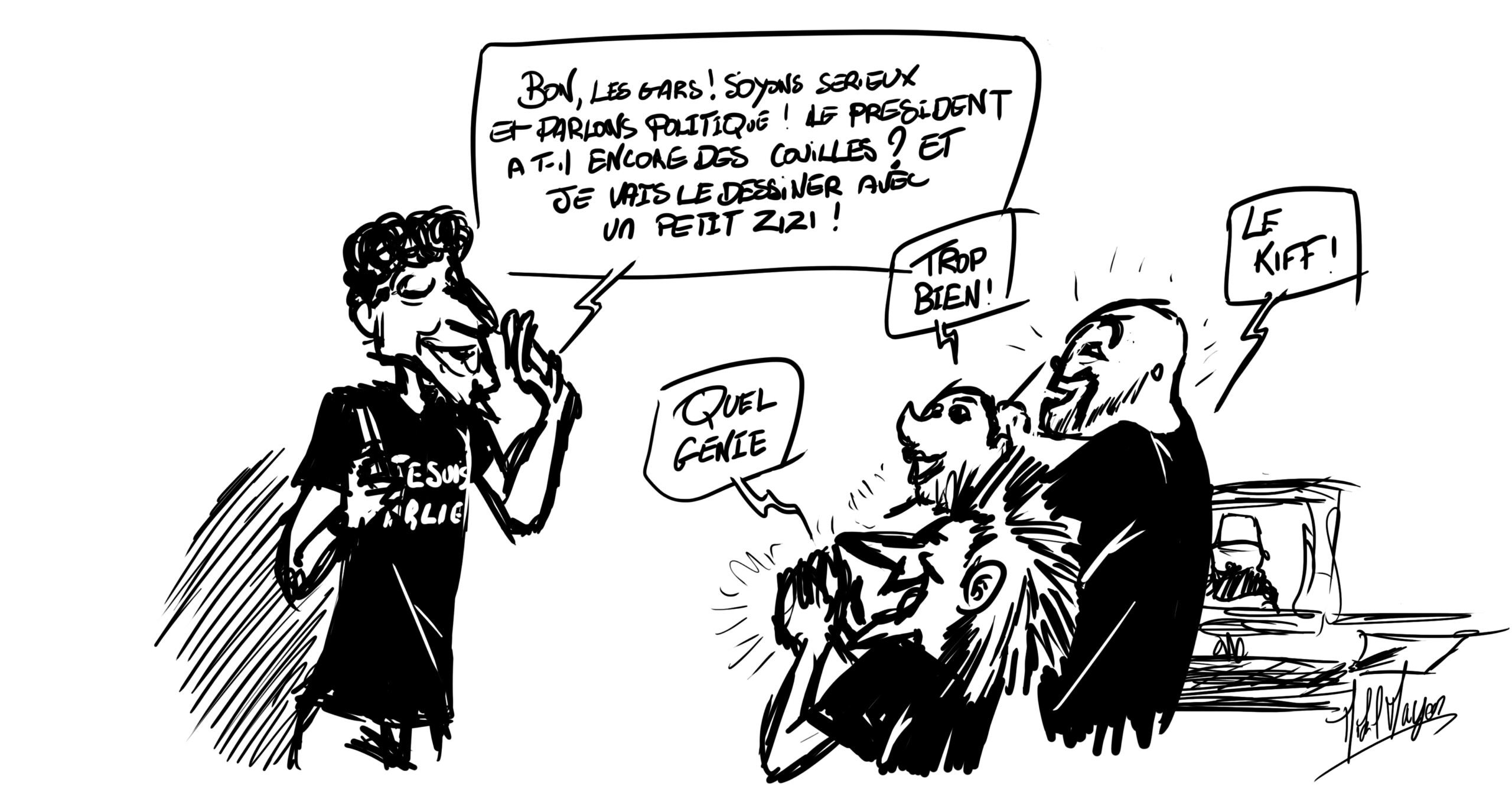 Ces trois planches, que j’ai réalisées pour accompagner cet article, prolongent directement mon propos. Dans la première, je montre ce réflexe presque automatique qui consiste à transformer un fait tragique en “idée de dessin”, sans recul ni construction. Dans la deuxième, je me suis moi-même auto-censuré : j’avais initialement envie d’aller plus loin dans l’humour, mais j’ai conscience que cela aurait pu être perçu comme insultant, et ce choix illustre justement cette limite que l’on s’impose aujourd’hui. Dans la troisième — celle mise en avant — je représente la satire comme un tir dirigé vers une cible vide, sans symbole ni message identifiable. À travers ces dessins, j’ai voulu montrer une mécanique qui tourne seule : on provoque, on choque, mais on ne sait plus vraiment pourquoi.
